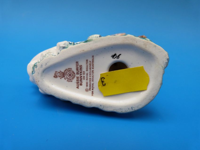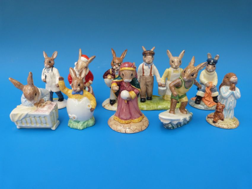 Ten Royal Doulton Bunnykins figures DB 170 Fisherman figures, DB55 Bedtime figures, DB 218 Fortune Teller figures, DB 133 Aussie Surfer figures, DB Jack and Jill figures, a DB 84 Fisherman figure, a DB 149 Easter Greetings figure, a DB 158 New Baby figure, a DB Happy Christmas figure and a DB 181 Doctor figure, all in original boxes