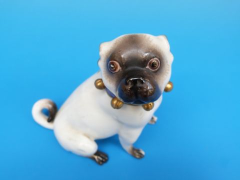 A Meissen figure of a pug with a collar of bells (10cm high)