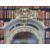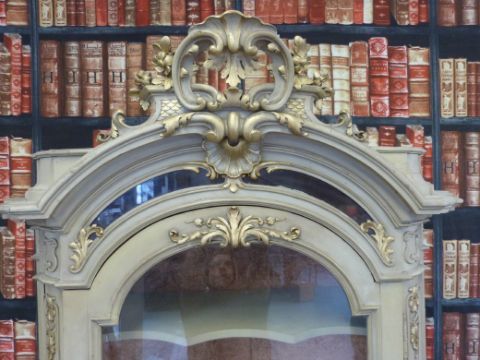 A 19thC French gilt and painted vitrine, the arch topped glazed door with curved glazed panels above, the sides with concave vertical glazed panels with further small glazed panel above, the base with single cupboard, the whole raised on scrolling feet (W115cm x D52cm x L231cm)
