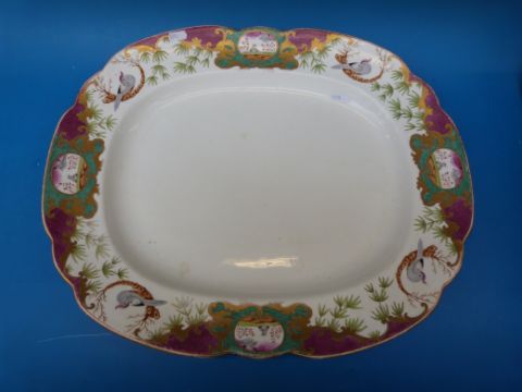 A large 19thC shaped meat platter with hand decorated scrolling decoration of exotic birds and foliage including four cartouches with gilt surrounds