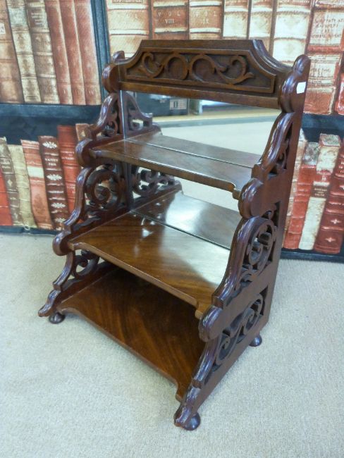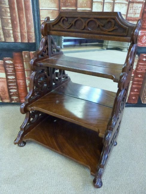 A late Victorian mahogany free standing three tier shelf unit with mirror back (H49cm)