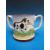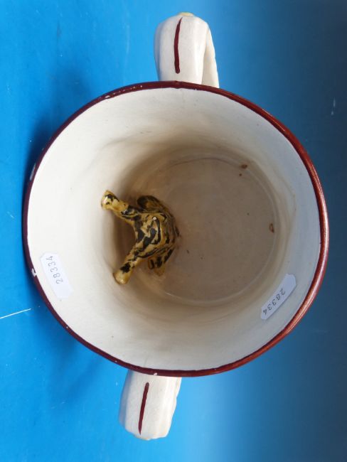 A large pottery frog mug with relief decoration of a spaniel / gun dog flushing and retrieving game (14cm tall, 14cm diameter)