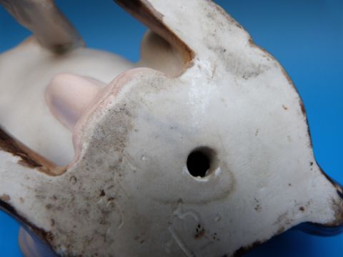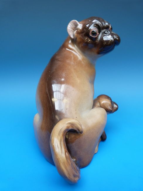 Two large 19thC Meissen pug dogs, one with pup at foot. The pug without pup 16.5cm tall, faint blue crossed swords mark in blue, the numbers 511 and 73 incised to base. The pug with pup 17.5cm tall, clear blue crossed swords and the numbers 515 and 73 incised to base