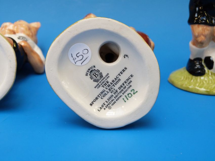 Two Football Felines by Beswick, boxed with certificate entitled "Dribble" together with a sporting character example "The Last Lion of Defence"