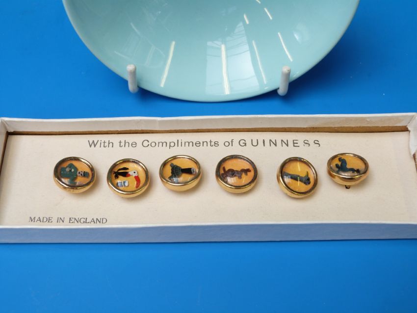 A cased set of six Guinness intaglio waistcoat buttons together with a Wade Guinness pin dish