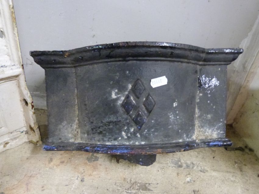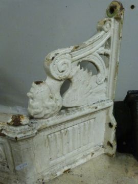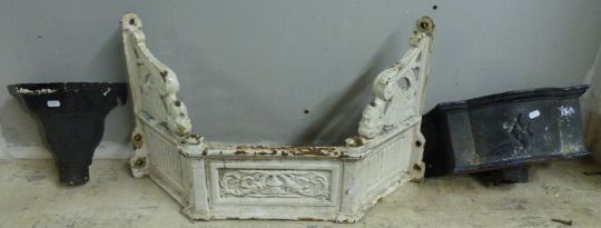 A 19thC cast iron corner washbasin or similar, the bracket marked Rd No. 170861 with two winged figural supports, together with two rainwater hoppers