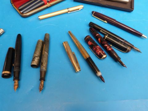 A collection of pens including Summit with 14k nib, Osmiroid, Parker Duofold with 14k nib, Parker Vacumatic, Parker Platinum, Parker 25 and a pen cigarette lighter
