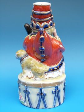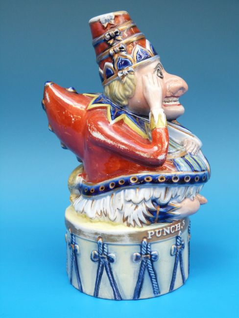 An unusual Staffordshire figure from Punch and Judy modelled with Punch astride a drum entitled Punch's Sauce (18cm tall)