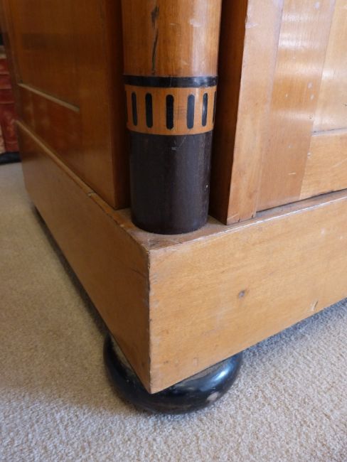 A Biedermeier satinwood and ebonised cabinet having part glazed doors flanked by columns terminating in ebony inlaid decoration, raised on squat ebonised bun feet (W139cm, D64cm H200cm)