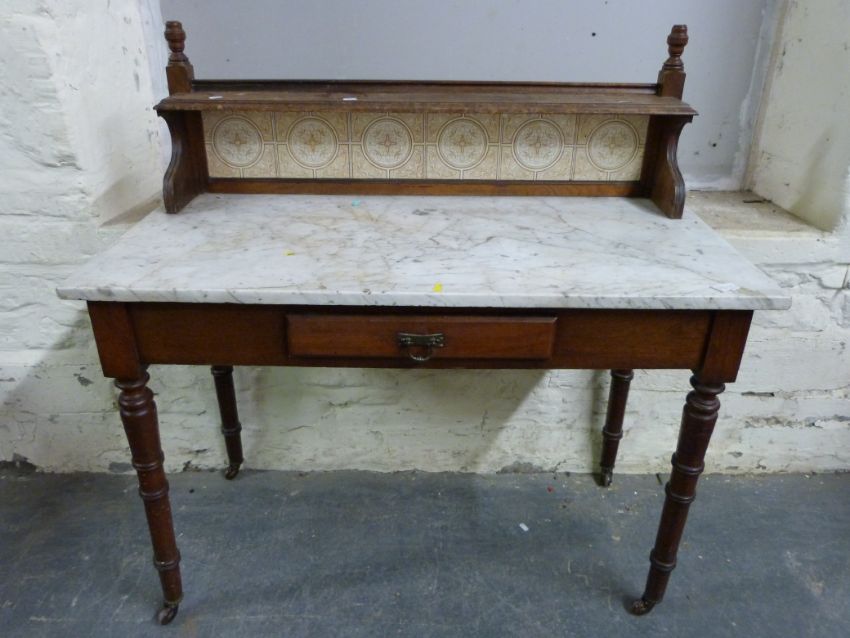 An oak marble topped single drawer washstand (W106, D51, H73cm)