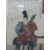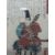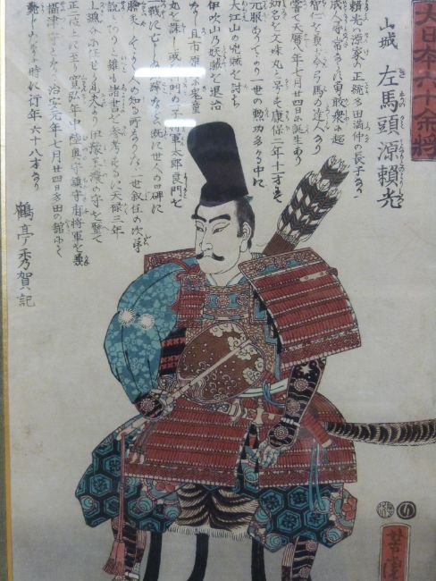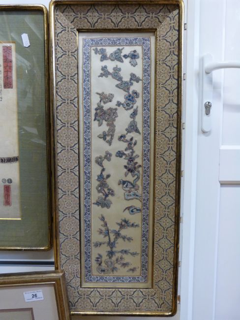 Two Oriental style framed pictures, one a textile of flowers, the other of a warrior, 36 x 24 cm