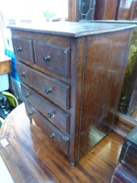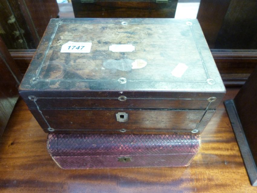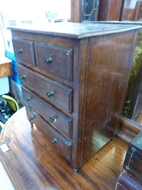 A 19thC miniature/apprentice chest of two over three drawers together with a leather jewellery box and a rosewood workbox