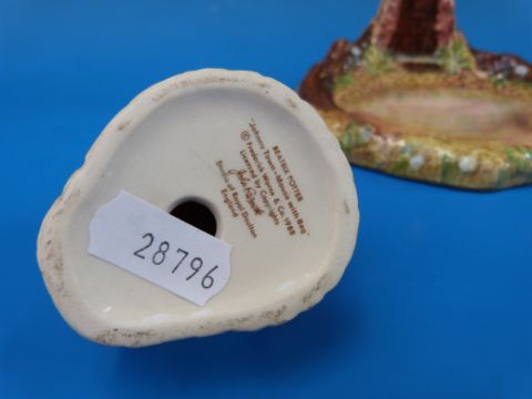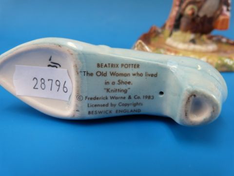 Four Beswick Beatrix Potter figures, "Tomasina Tittlemouse", "Johnny Town Mouse with Bag", "Squirrel Nutkin", "The Old Woman Who Lived in a Shoe Knitting", all with brown back stamps, and a Beswick Beatrix Potter lamp base