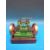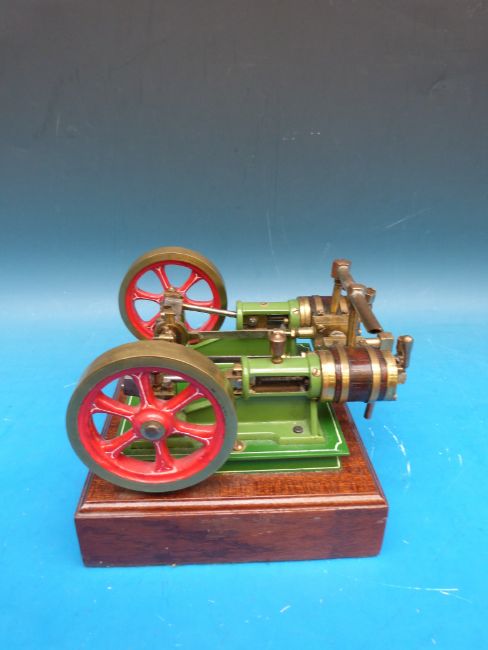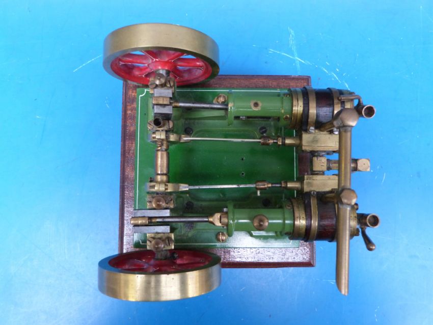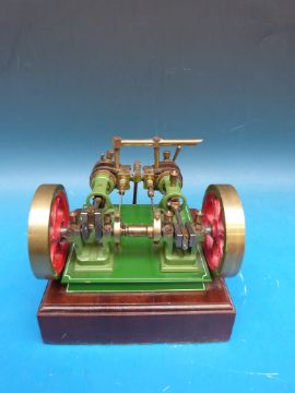 A twin cylinder steam engine with twin flywheels, wood-clad cylinders and lubricating cups