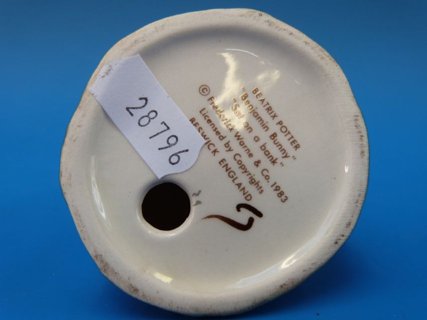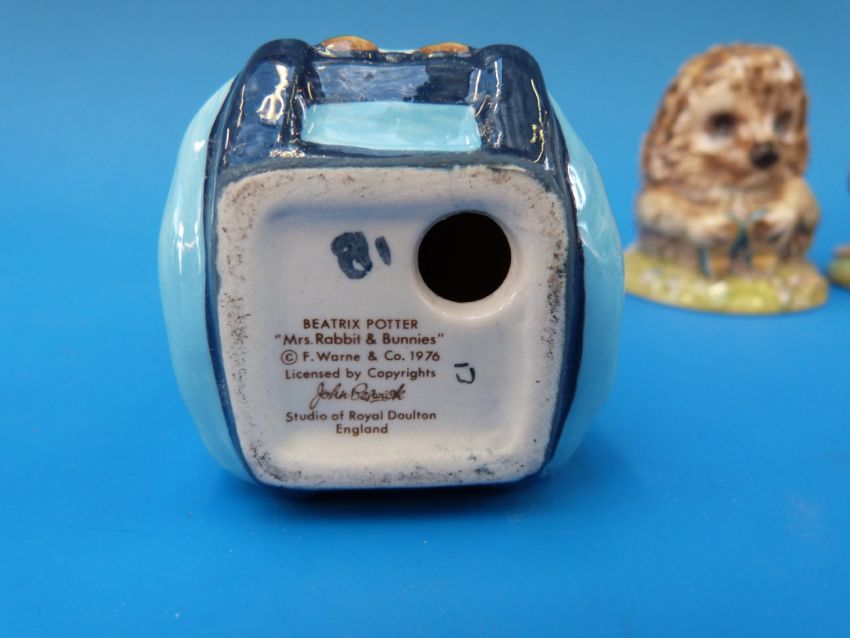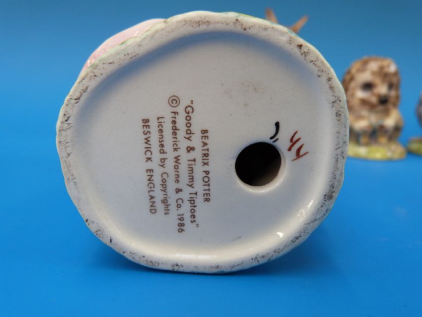 Five Beswick Beatrix Potter figures,"Goody and Timmy Tiptoes", "Tomasina Tittlemouse", "Benjamin Bunny sitting on a bank", "Mrs Rabbit and Bunnies", "Mr Pricklepin", all with brown back stamps