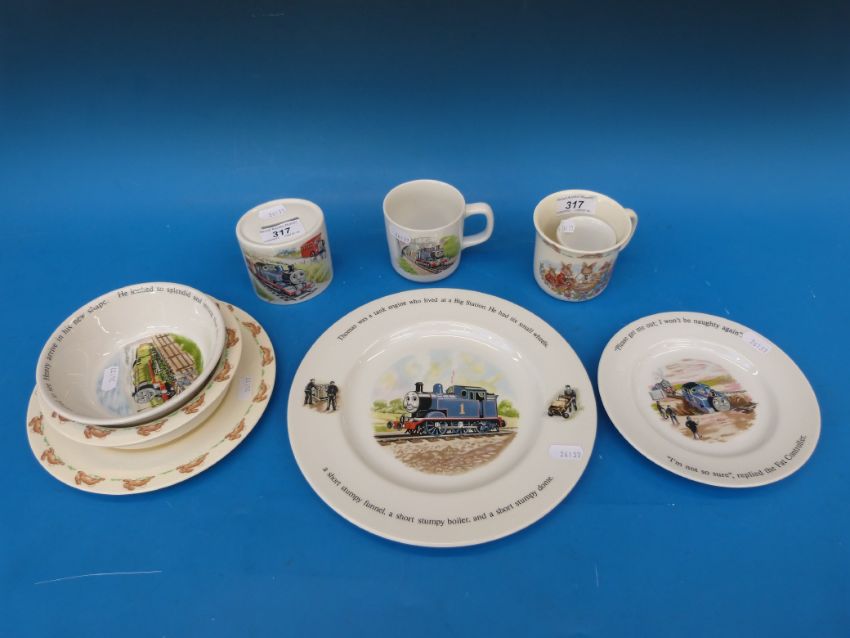 A collection of ceramics to include Thomas the Tank Engine plates, bowl, mugs by Wedgwood and money box, together with three Bunnykins examples by Royal Doulton