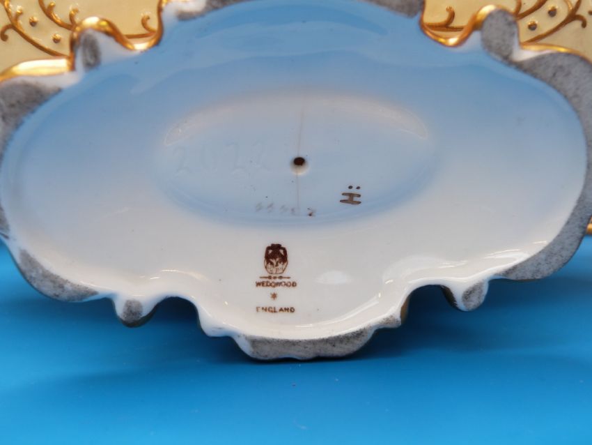 A hand-painted Wedgwood pedestal pot pourri and lidded vases garniture set with reticulated lids and cartouches of lake and river scenes, indistinctly signed J H Plant (vases 22cm high, pot pourri 25cm long)