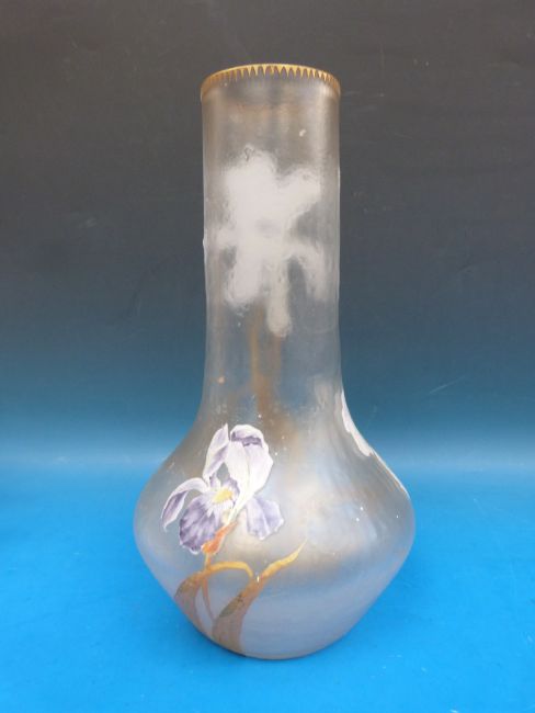 August Jean-Francois Legras, Mont Joye & Cie, Art Nouveau cameo glass vase, the acid cut body with enamelled and gilded decoration of irises and cameo cut gilded border, gilded mark to base, 33.5cm tall.