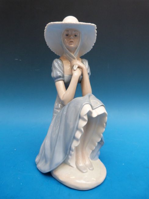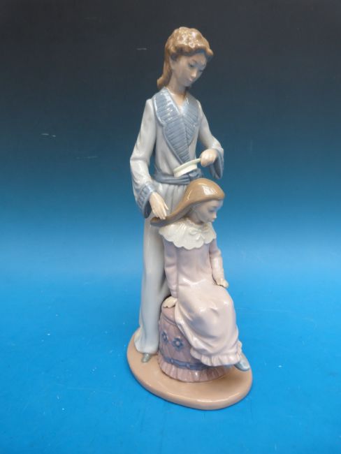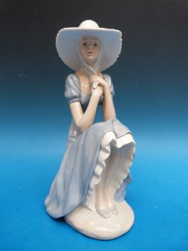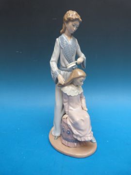 Three Nao figures comprising mother and daughter and two seated girls in bonnets (tallest 29cm)