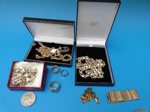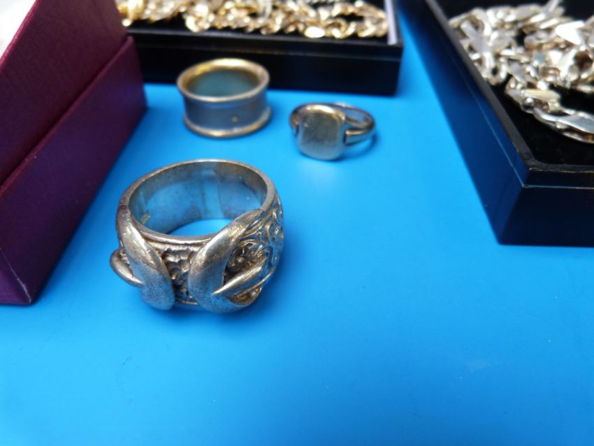 A very large hallmarked silver buckle ring, silver signet ring, four heavy link bracelets marked 925 silver (166g), two heavy link necklaces marked 925 silver (197g), a necklace marked 925 etc