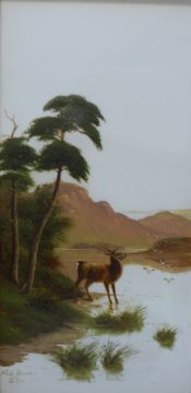 B Davis: A pair of oils on glass of Highland scenes, one titled "Above Braemar", the other "On Loch Achray", each in gilt frame 60cm x 29cm