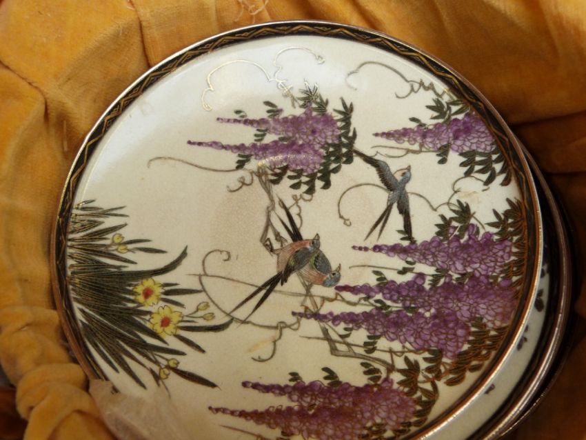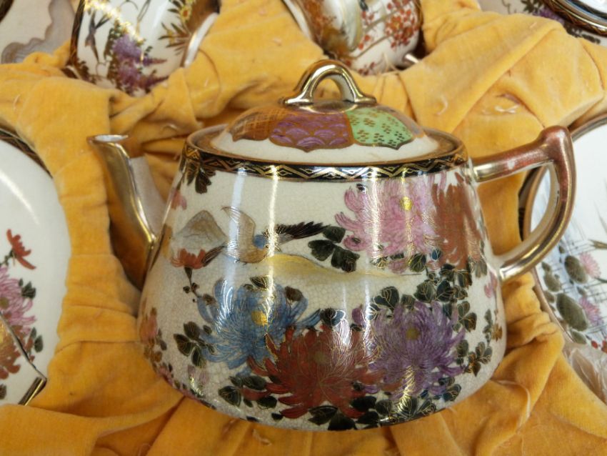 A boxed Japanese Satsuma tea set decorated with floral and bird scenes, signed, Meiji period