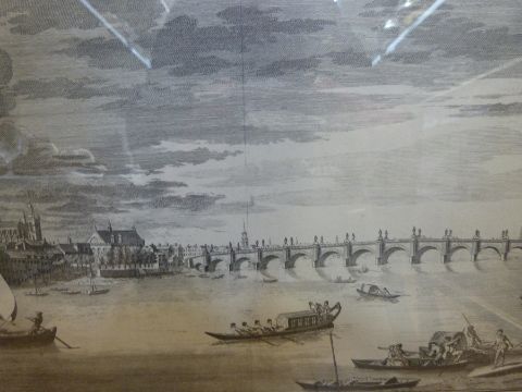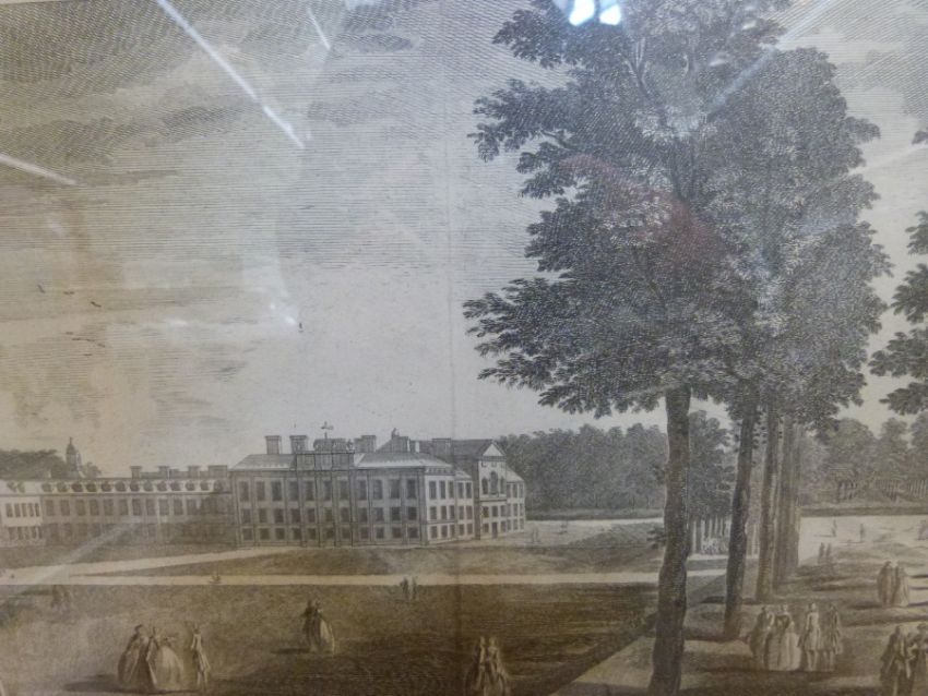 Four gilt framed black and white prints of views of London, Coln Gallery label verso, to include Westminster Bridge, Lambeth Palace, Kensington Palace and St. James' Park