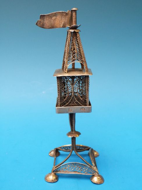 A white metal filigree incense burner on stand with flag finial, possibly Polish silver marks, (height 17.5cm, 103g)