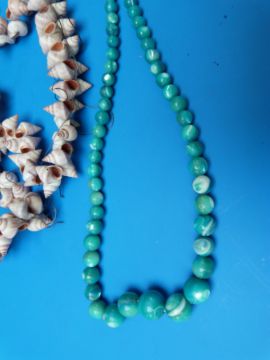 A large shell necklace and a beaded mother of pearl turquoise necklace