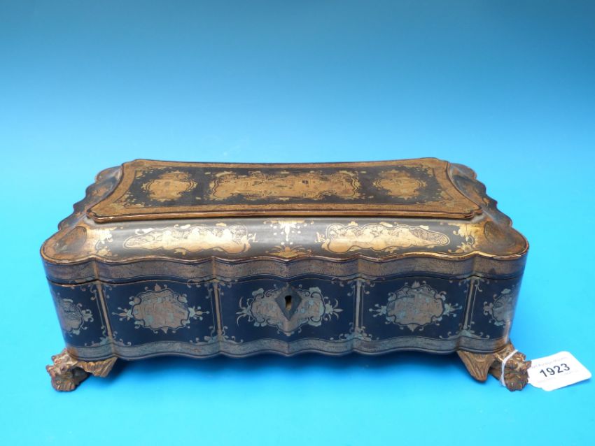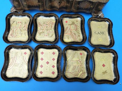 A Chinese lacquer gaming box, opening to reveal a box and various trays with suits