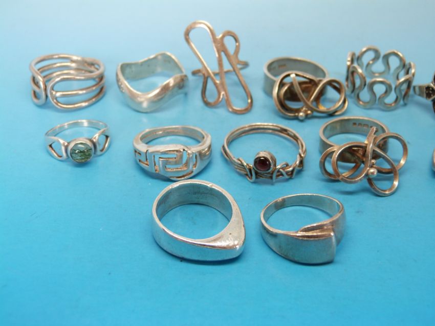 Ten white metal rings marked 925 in various designs to include Greek key design together with five hallmarked silver rings and two designer rings maker CHT, one set with moss agate and one set with a garnet