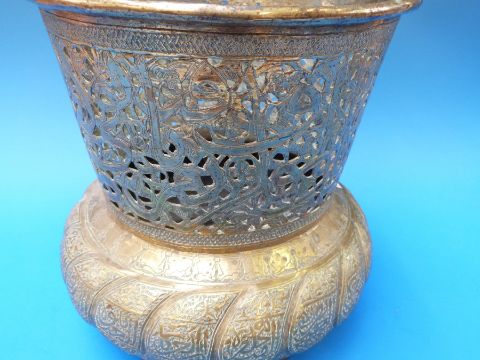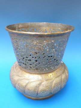 A Persian brass jardiniere with openwork flared rim and bands of calligraphy around the centre of the body, 26cm tall