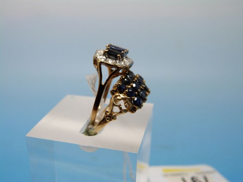 Two 9ct gold rings, one set with three rows of sapphires and the other set with three sapphires surrounded by diamonds (size M)