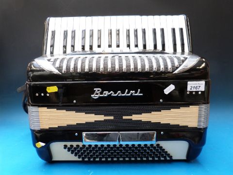 A C1980 Borsini 96 bass piano accordion with five treble couplers and two bass couplers in black finish by repute used by a female recording artist (with case)