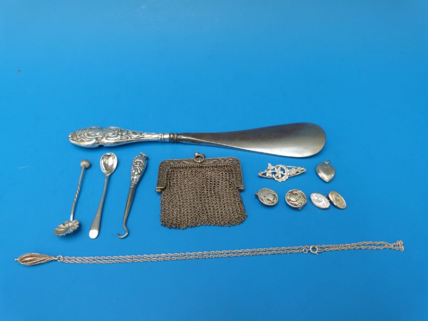 A white metal mesh purse, two hallmarked silver salt spoons, hallmarked silver handled shoe horn and button hook, together with various silver and white metal items