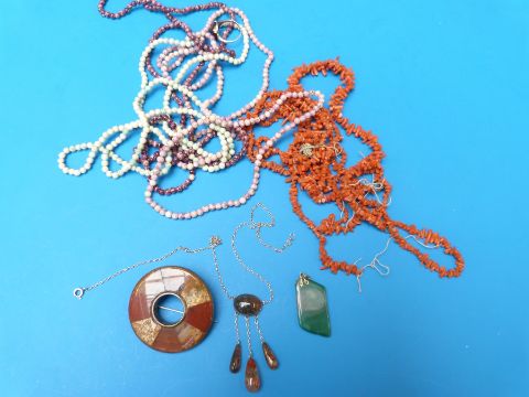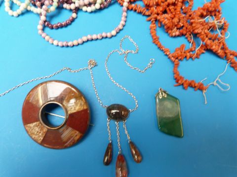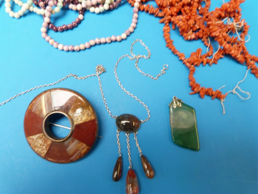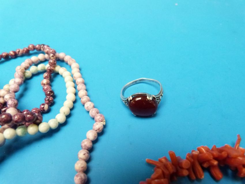 Three coral necklaces, other beads, an agate specimen brooch, necklace set with moss agate, silver ring etc