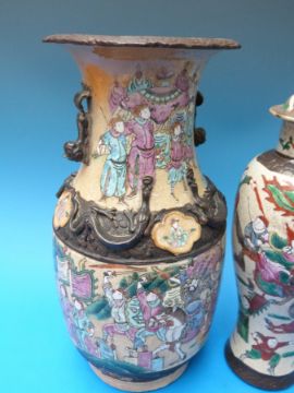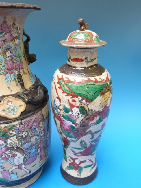 Two 19thC Chinese crackle glaze vases with warrior decoration (tallest 36cm)