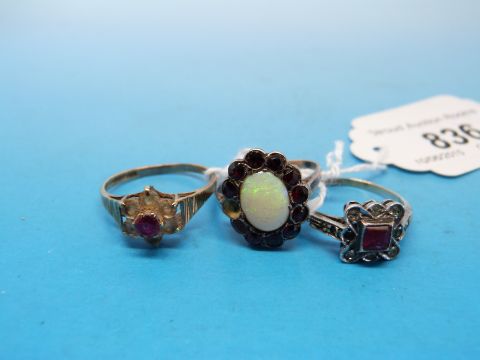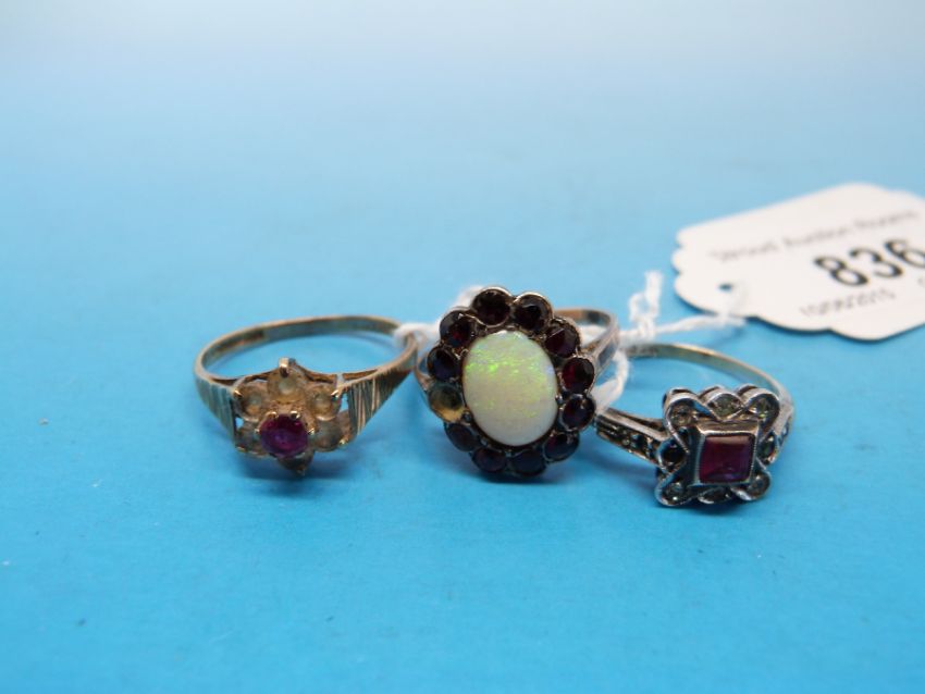 Two 9ct and silver rings, one set with an opal surrounded by red stones, the other set with a red stone together with another 9ct gold ring