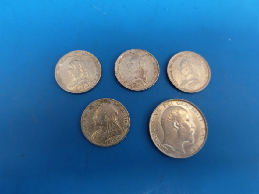 Four Victorian 6d 1887 and 1895 , two with shield backs together with an Edward VII shilling all VF- EF