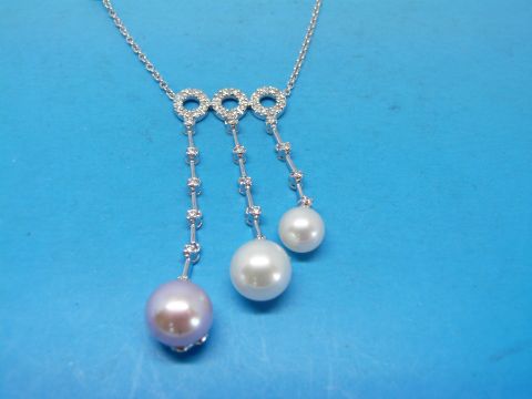 A white metal necklace marked 750, the three central circles set with diamonds, each with a dropper set with a pearl.