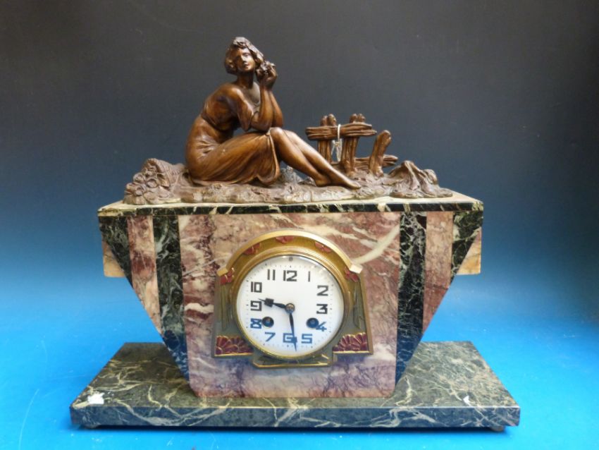 An Art Deco clock decorated with spelter surmount of a pensive lady signed Limousin