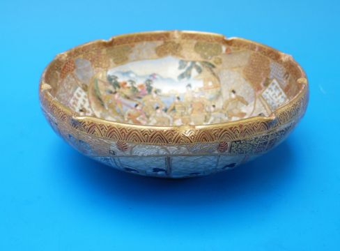 A Japanese Satsuma bowl decorated with warriors, immortals and geishas (signed) Meiji period