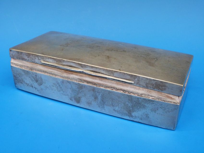 A hallmarked silver cigarette box of oblong form, (length 20cm)