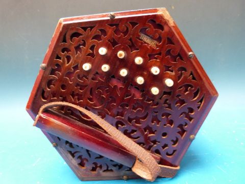 A Lachenal 21 key concertina (c1900s) with rosewood fretworked ends, bone buttons and steel reeds (reg no. 183360)