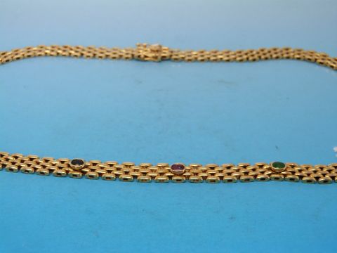 An 18ct gold necklace of elongated flat links, the centre section set with emeralds, sapphires and a ruby (52g)