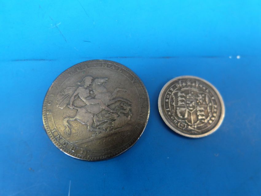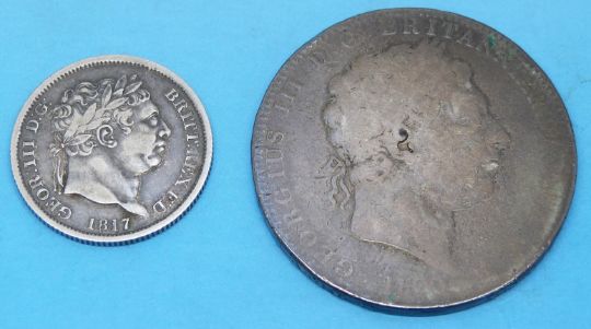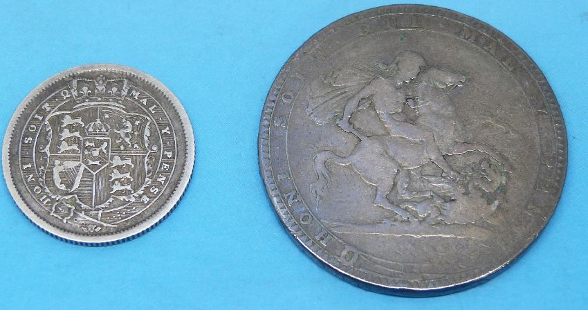 A George III crown together with a bull neck George III shilling
