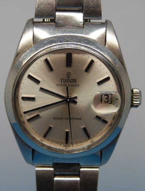 A Tudor Oyster Date gentleman's wristwatch with button numerals on brushed stainless steel face with date aperture, on stainless steel bracelet
