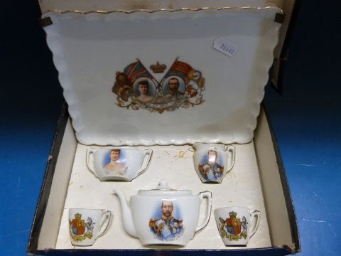 A cased George V commemorative miniature tea service together with a commemorative medal