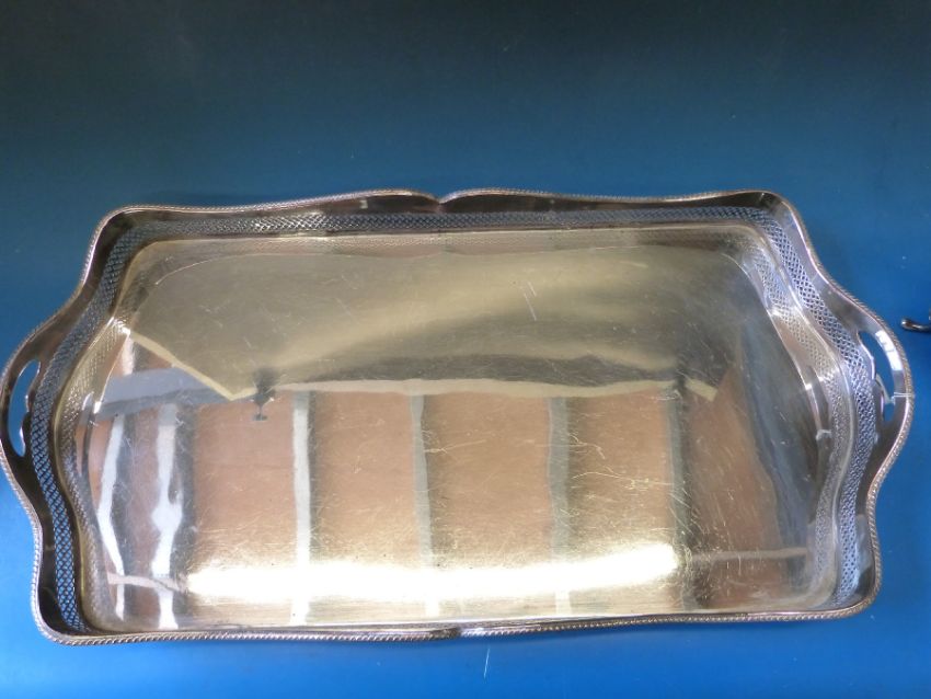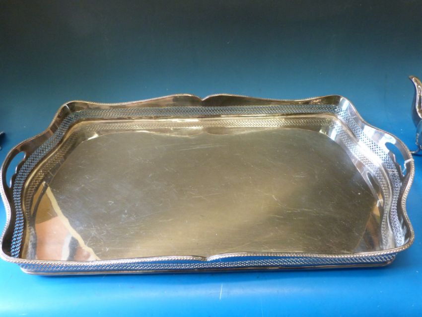 An Edwardian plated pierced gallery tray with Walter & Hall and other teaware
