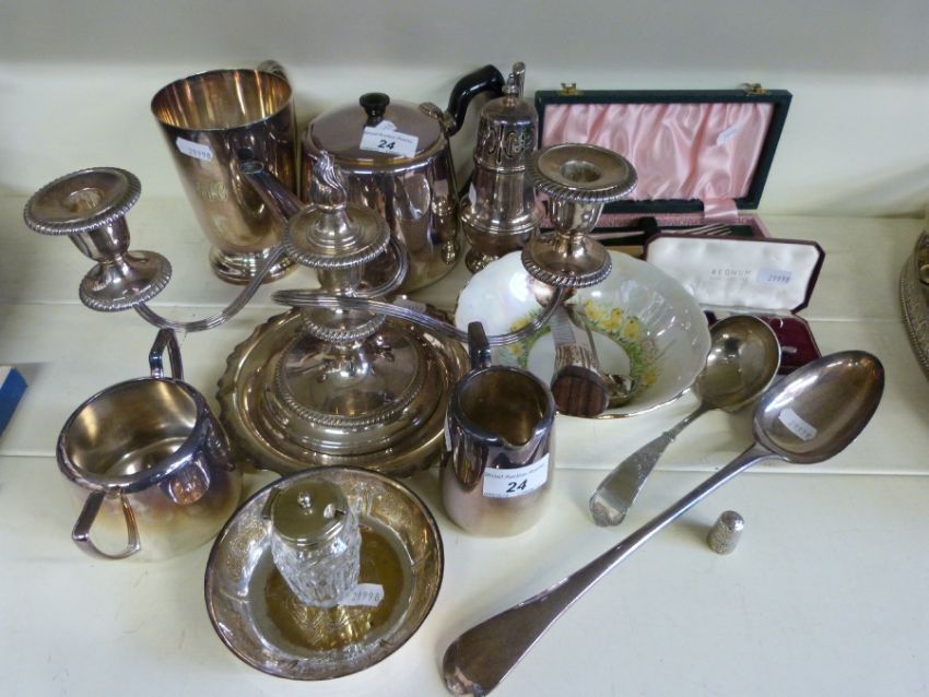 A quantity of silver plate including candelabra, tankards, basting spoon, Charles Horner silver thimble etc